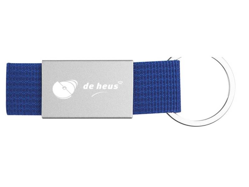 Brelok składający się z kolorowej taśmy i metalowej tabliczki.